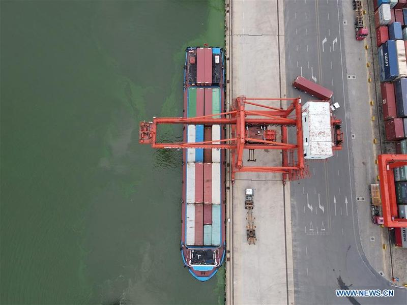 Aerial photo taken on Aug 21, 2020 shows a cargo ship berthing at the International Container Terminal of Hefei Port in Hefei, East China's Anhui province. [Photo/Xinhua]