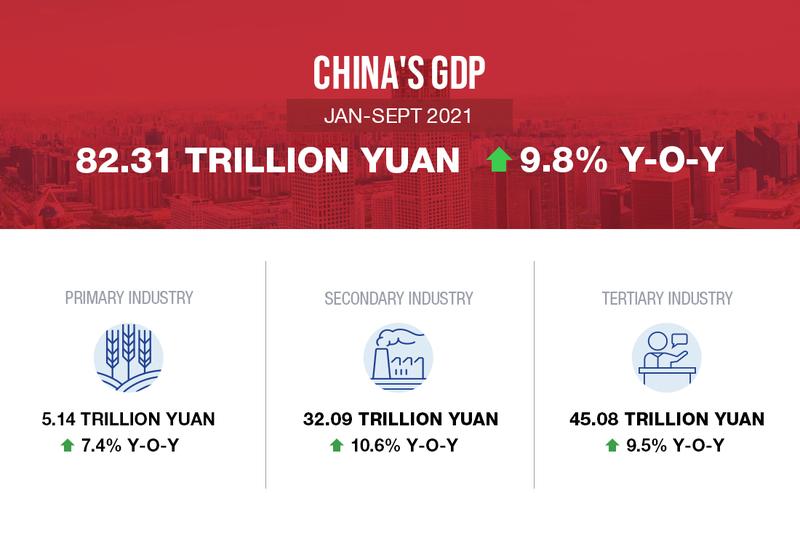 China's gross domestic product (GDP) totaled over 82.31 trillion yuan (US$12.79 trillion) in the first three quarters of 2021, up 9.8% year on year, according to a press conference on the country's economic performance on Monday.