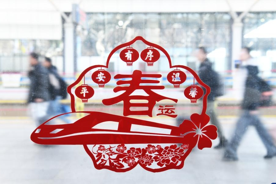 A paper cut themed on the Spring Festival travel rush is seen at the Lijiang Railway Station in Lijiang, southwest China's Yunnan Province, March 13, 2026. The 2026 Spring Festival travel rush comes to an end on Friday. (Photo by Zhao Qingzu/Xinhua)