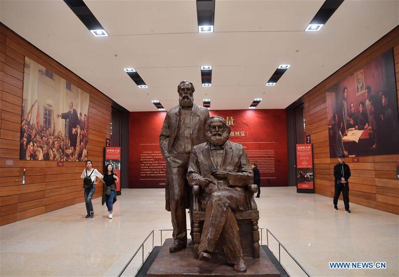 A sculpture of Karl Marx (R) sitting next to Friedrich Engels is displayed at "The Power of Truth", an exhibition marking the 200th anniversary of Karl Marx's birth, at the National Museum of China in Beijing, capital of China, May 5, 2018. The exhibition was opened here on Saturday. It features Marx's life, sinicized Marxism and Marxism-themed contemporary art. [Photo/Xinhua]