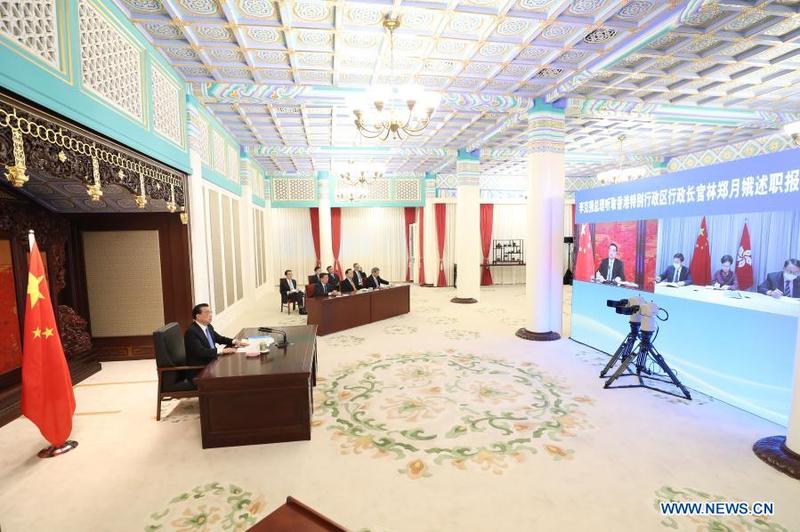 Premier Li Keqiang on Wednesday heard a work report delivered via video link by Chief Executive of the Hong Kong Special Administrative Region (HKSAR) Carrie Lam on the HKSAR government's work in 2020.