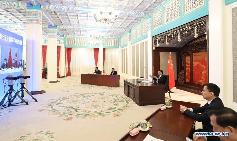 Chinese Premier Li Keqiang hears a work report delivered via video link by Chief Executive of the Hong Kong Special Administrative Region (HKSAR) Carrie Lam on the HKSAR government's work in 2020, in Beijing, capital of China, Jan. 27, 2021. Vice Premier Han Zheng also attended the event. (Xinhua/Wang Ye)