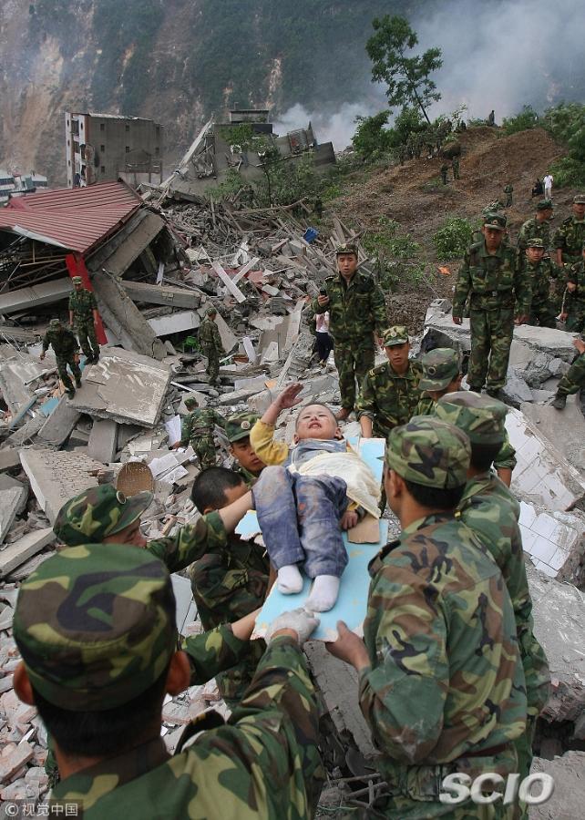 Lang Zheng, a boy who had injured his left arm during the quake, raised his right arm in salute to the PLA soldiers as they carried him out of the rubbles on a stretcher. The image touched people across the country. Today, he has grown into a teenager who excels in school and likes playing basketball.