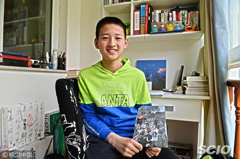 Lang Zheng, now a 1.7-meter-tall middle school student, holds the famous picture of his rescue in his home in Mianyang city on April 14, 2018. [Photo/VCG]