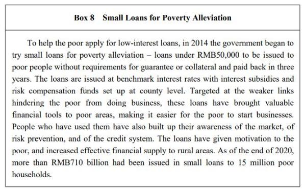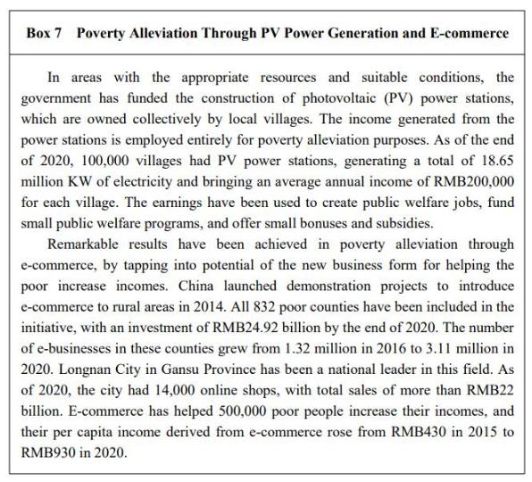 First, boosting the economy to provide more job opportunities. Poverty alleviation through economic development is the most direct and effective method, the fundamental way to give poor areas the capacity for independent development and help the poor find employment locally. With this in mind, China has supported and guided poor areas in developing economic activities geared to their available resources, and encouraged poverty alleviation through new forms of business and new industries such as e-commerce, photovoltaic (PV) power generation and tourism, and through the consumption of products and services from poor areas (Box 7). Relying on collaboration on poverty alleviation between the eastern and western regions, China has facilitated the transfer of food processing, clothes manufacturing, and other labor-intensive industries from the east to the west. With the growth of such specialty industries, poor areas have gained economic momentum. More than 300,000 industrial bases have been built, leading to the creation of new industries with distinctive features and greater capacity to facilitate poverty alleviation efforts. China has created 12,000 local agroproduct brands, 14,400 leading enterprises above the city level, and 719,000 rural cooperatives operated by farmers. A total of 72.6% of poor households have formed close ties with new types of agribusiness entities, and almost every poor household has been covered by policy support for boosting the economy. Almost all poor people with the ability and intention to work have joined the collective endeavor. Solid progress has been made in poverty alleviation through the development of science and technology. A total of 1,290 innovative platforms and business startups have been set up, and 77,000 people have been paired up with professionals to receive guidance on new technology in impoverished regions. With a team of 289,800 technicians and a fund of over RMB20 billion, China has launched 37,600 high-tech programs of all kinds and at all levels and introduced more than 50,000 advanced applied technologies and new, improved breeds. Poor households have received financial support such as small loans (Box 8). In poor villages, entrepreneurial individuals have been encouraged to start businesses and given support to help and lead others out of poverty.