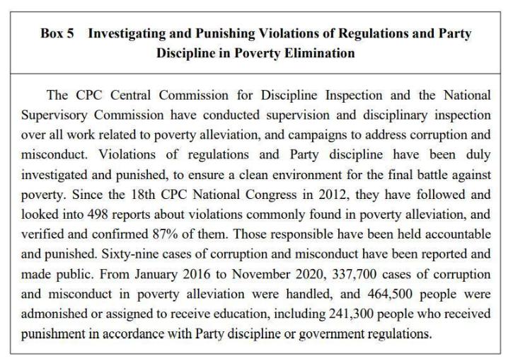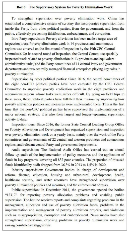 Poverty eradication work covers a wide range of areas and is extremely complex, thus requiring rigorous organization, leadership, and implementation. Relying on the CPC's political and organizational strength, China has established a poverty eradication management network with the central government acting as coordinator, provincial governments taking overall responsibility, and city and county governments overseeing implementation. The network covers all poor areas and officials are sent to villages to help every needy household. Party committees at all levels have assumed an overall coordinating role and assigned top officials to take charge of poverty eradication affairs. The leading officials of 22 provinces and equivalent administrative units in central and western China signed written pledges to the Party Central Committee, and Party secretaries at the five administrative levels of province, city, county, township and village have worked towards the same goal. During the poverty eradication campaign, Party committee secretaries and county governors have been required to remain unchanged in their posts. Areas tasked with poverty elimination worked out timetables with a clear division of responsibilities and pressed forward with implementation. In places where the work was particularly difficult, the fight against poverty became the top priority of social and economic development. Through the strictest possible evaluation and supervision, as well as specialized inspection tours, China has addressed any corruption and misconduct in poverty alleviation with rigor (Box 5), and strengthened the evaluation and supervision of results to ensure solid and authentic outcomes (Box 6) that can survive the test of time and practice. China has improved the incentives for encouraging officials to fulfill responsibilities and undertake initiatives, and the relevant mechanisms to protect their position. By giving more attention to and caring for officials and establishing the right approach to their selection and appointment, the government has given them the incentive to fulfill their duties and do their best in the final fight against poverty. China has strengthened its team of grassroots officials working in poverty alleviation, and formed resident working teams to assign officials to villages where they could be most useful. Officials on the resident working teams must be politically reliable and professional, and have a can-do approach to their work. Officials on these teams have dedicated themselves to their mission and fulfilled their duties, committing themselves to helping those in need on the front line of fighting poverty, and giving their all to help the poor find ways to emerge from poverty and seek development. The first group of first secretaries and resident working teams were dispatched to poor villages in 2013. By 2015, all poor villages had resident working teams, and every poor household a contact official in charge of poverty elimination. As of the end of 2020, 255,000 resident teams and more than 3 million officials had been dispatched as first secretaries and resident officials to poor villages, fighting on the front line of poverty alleviation alongside nearly 2 million township officials and millions of village officials.