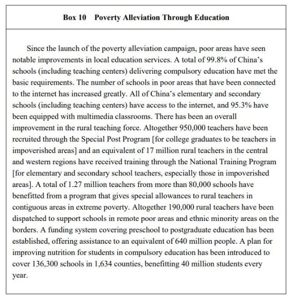 Fourth, improving education in impoverished areas. Through education, poverty can be prevented from passing down from generation to generation (Box 10). The government has continued to increase support for schools in poor areas to improve their conditions, standard of teaching, faculties and financial resources. The state ensures compulsory education for all school-age children. All the 200,000 dropouts from compulsory education coming from poor families have returned to school. Favorable policies have been leveraged to enroll more poor students from designated areas, expand employment for graduates, and help students shake off poverty through vocational education. More than 8 million middle and high school graduates from poor families have received vocational training, 5.14 million poor students have received higher education, and key institutions of higher learning have admitted some 700,000 students from designated rural and poor areas. All this has opened up more channels for poor students to emerge from poverty and move upwards in society. The government has offered training on standard spoken and written Chinese language to 3.5 million rural teachers and young farmers and herdsmen in ethnic minority areas, in an effort to make poor people from these areas more competitive in the job market. A pilot campaign has been launched to teach standard Chinese to preschool children in Liangshan Yi Autonomous Prefecture, and Mabian Yi Autonomous County, Ebian Yi Autonomous County and Jinkouhe District in Leshan City, Sichuan Province, involving 430,000 children.