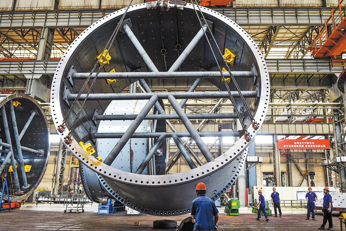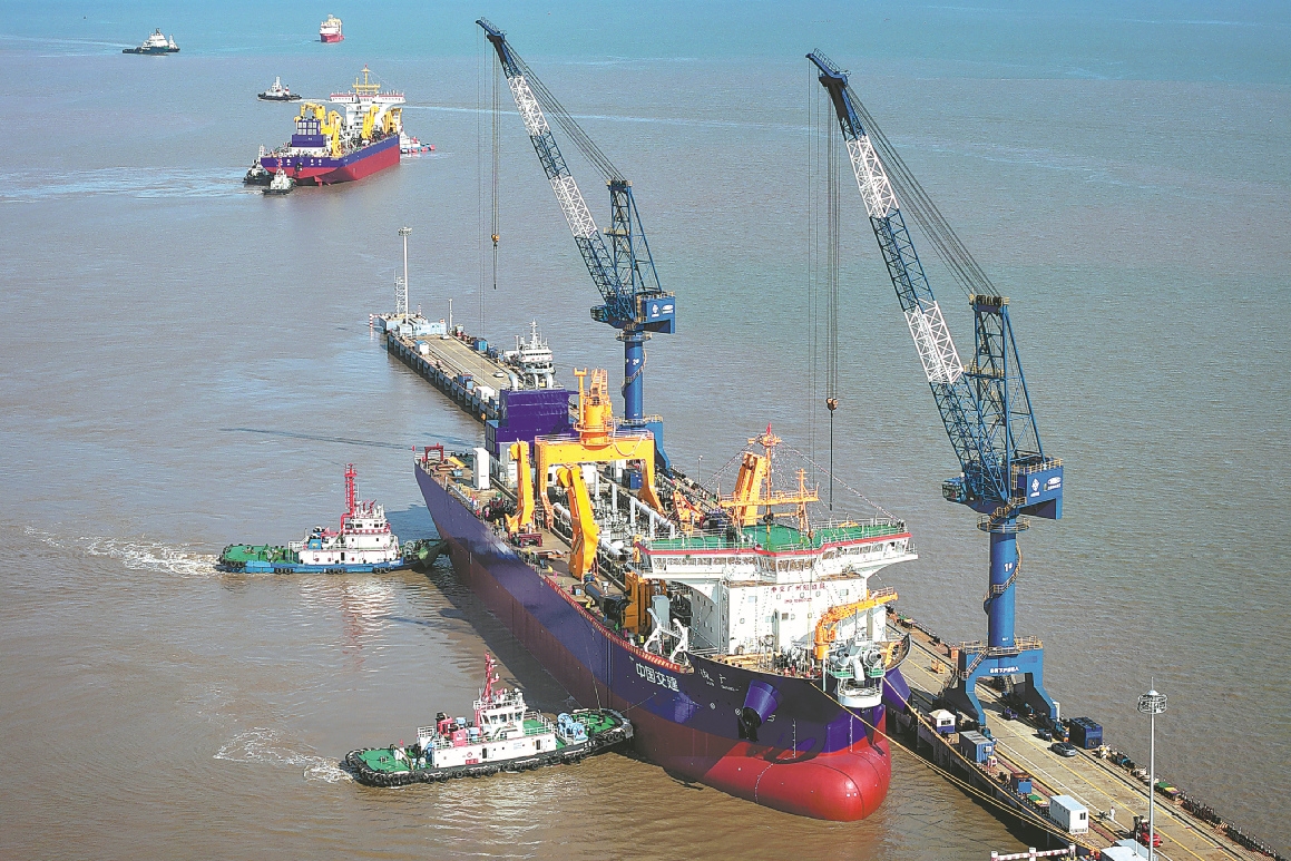 Two super-sized dredgers, each with a capacity of 35,000 cubic meters, were undocked on Tuesday in Qidong, Jiangsu province.