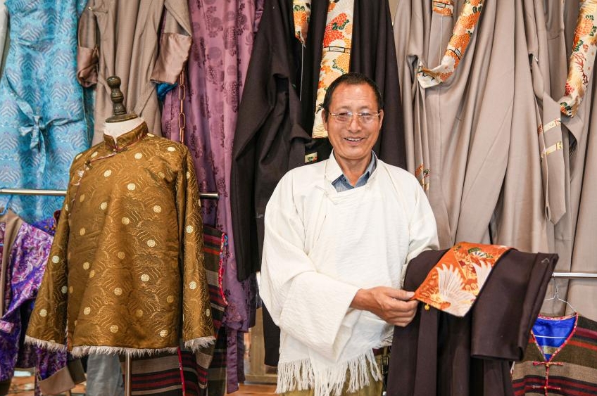 Losang Monlam poses for a portrait in front of finished Tibetan costumes at the Sholdo Pal traditional handicrafts school in Lhasa, southwest China's Xizang Autonomous Region, Aug. 15, 2025. Traditional Tibetan costumes, after centuries of evolution and development, have formed rich styles and unique features.
