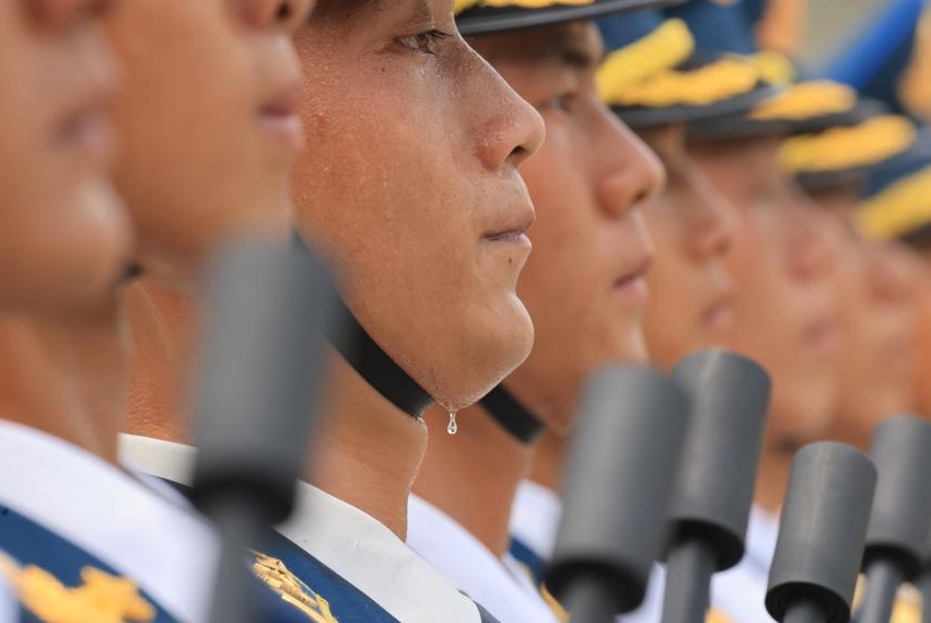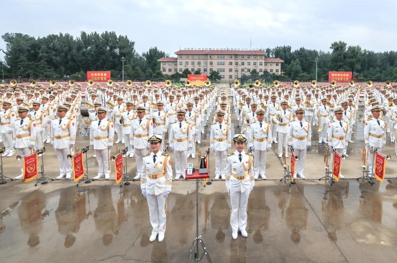 Members of the joint military band of the Chinese People's Liberation Army take part in a training for the upcoming V-Day military parade in Beijing, capital of China, Aug. 12, 2025. Participants are busy preparing for the upcoming V-Day military parade scheduled on Sept. 3 in Tian'anmen Square to mark the 80th anniversary of the victory in the Chinese People's War of Resistance Against Japanese Aggression and the World Anti-Fascist War.