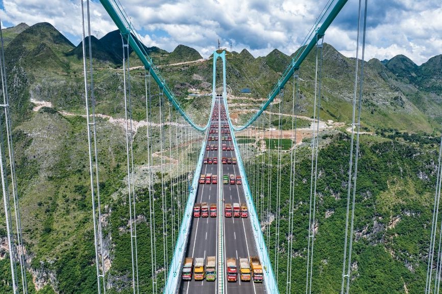 The Huajiang Grand Canyon Bridge, poised to become the tallest in the world, stretches across this abyss with its final test just completed on Monday.