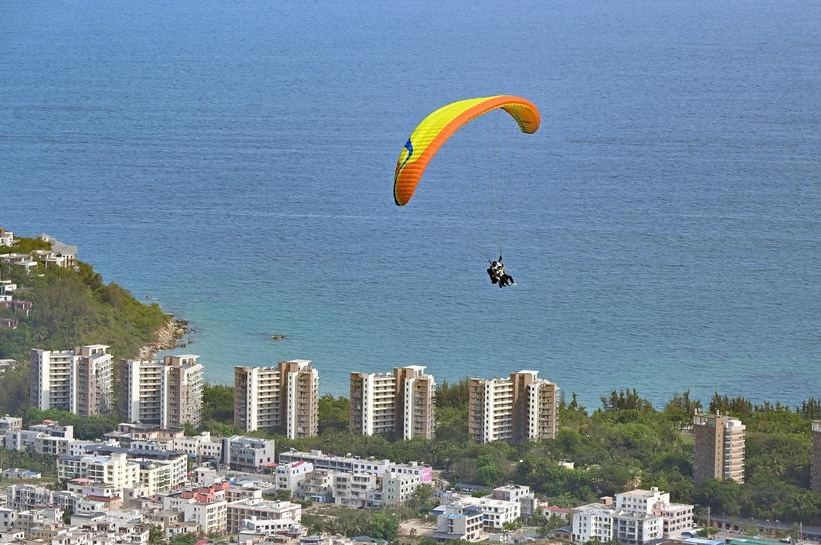 A helicopter was slowly ascending, offering a breathtaking view of the vast blue ocean below and the stunning tropical coastal city of Sanya in south China's Hainan.