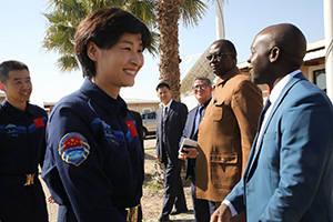 Liu Yang, China's first female astronaut in space, and her colleague Chen Dong arrived in Namibia's port town of Walvis Bay on Monday, starting their five-day visit to the southern African nation at the invitation of President Hage Geingob.