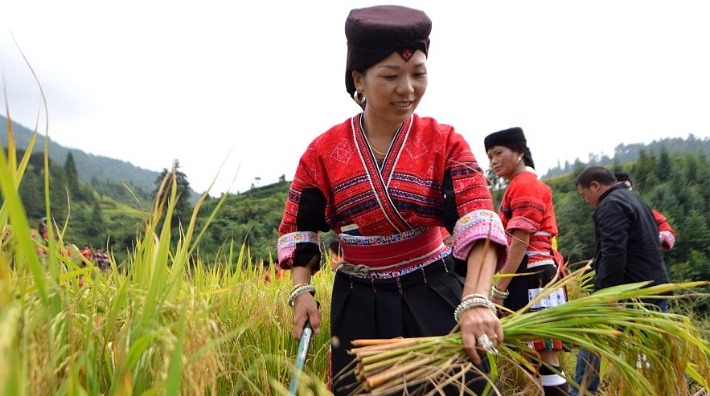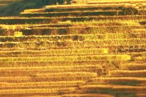 Honghe Hani Terrace reachs to over 2,000 m above sea level. Its rice field now glimmer with a golden glow, as the rice is ready for harvest.