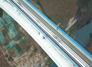 A section of a bridge swivels into position on an under-construction high-speed rail line.