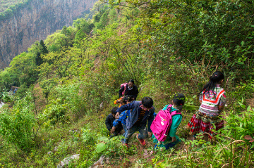 A teacher in a rural area of southwest China's Guizhou province has spent the last 31 years escorting students as they climb a cliff to their school.
