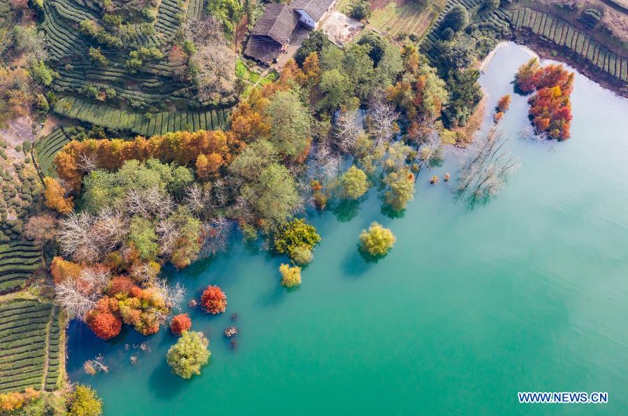 Aerial photo taken on Nov. 29, 2020 shows the winter scenery of the reservoir bank at Three Gorges area in Lanlingxi Village of Zigui County in Yichang, central China's Hubei Province. (Photo by Zheng Jiayu/Xinhua)