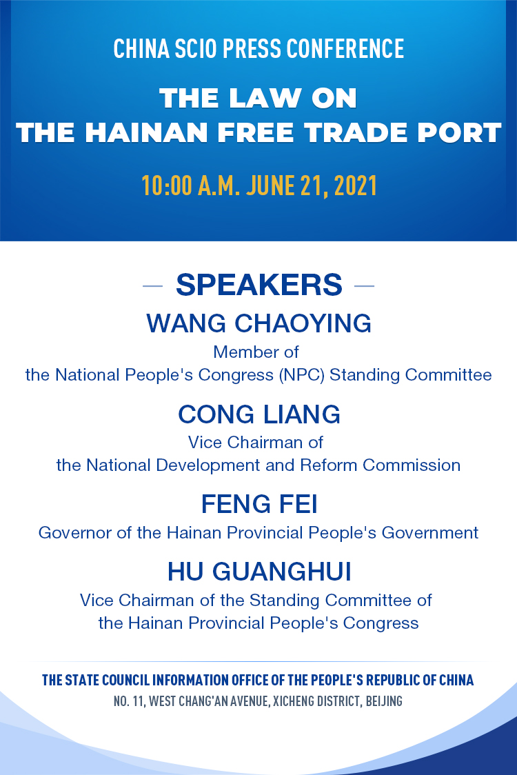 The State Council Information Office (SCIO) will hold a press conference at 10 a.m. Monday about The Law on the Hainan Free Trade Port.