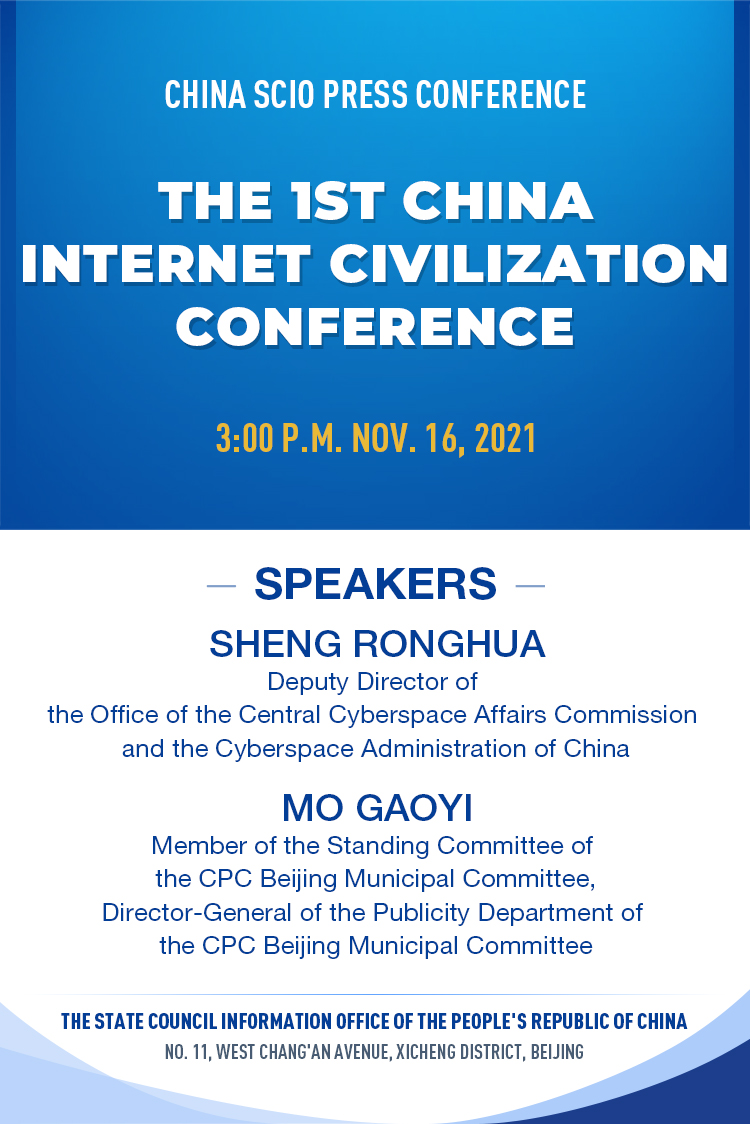 The State Council Information Office (SCIO) will hold a press conference at 3 p.m. Tuesday on the 1st China Internet Civilization Conference.