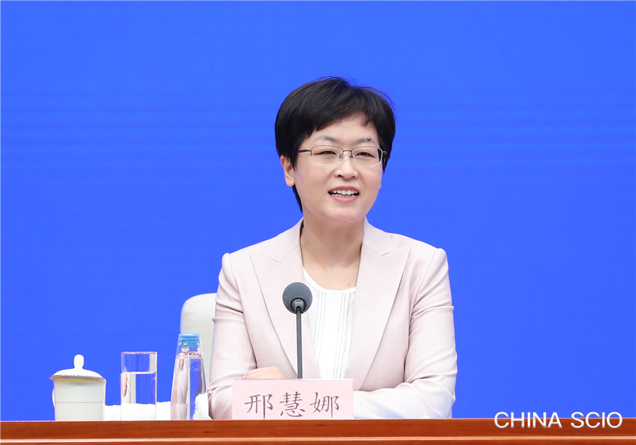 Xing Huina, deputy director general of the Press Bureau of the State Council Information Office (SCIO) and spokesperson of the SCIO, presides over a press conference in Beijing on Nov. 15, 2021. [Photo by Luan Haijun/China SCIO]