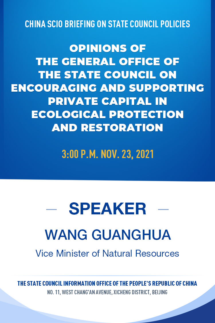 The State Council Information Office will hold a policy briefing at 3 p.m. Tuesday about the Opinions of the General Office of the State Council on Encouraging and Supporting Private Capital in Ecological Protection and Restoration.