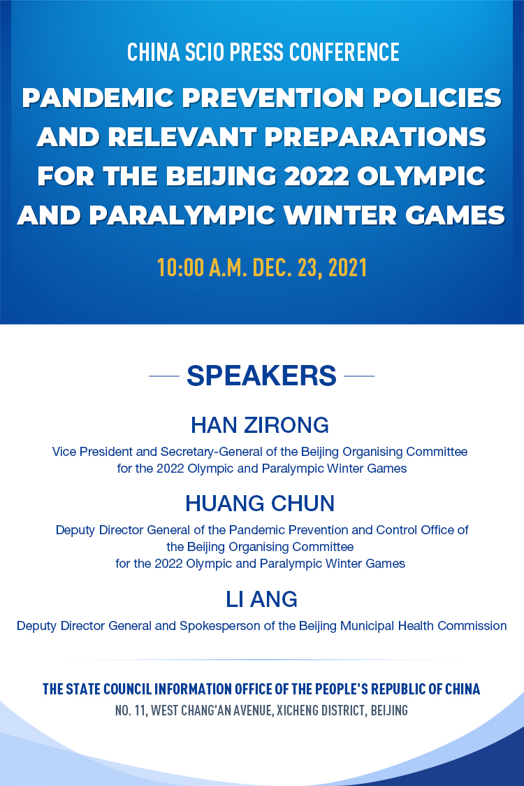 The State Council Information Office (SCIO) will hold a press conference at 10 a.m. Thursday on pandemic prevention policies and relevant preparations for the Beijing 2022 Olympic and Paralympic Winter Games.