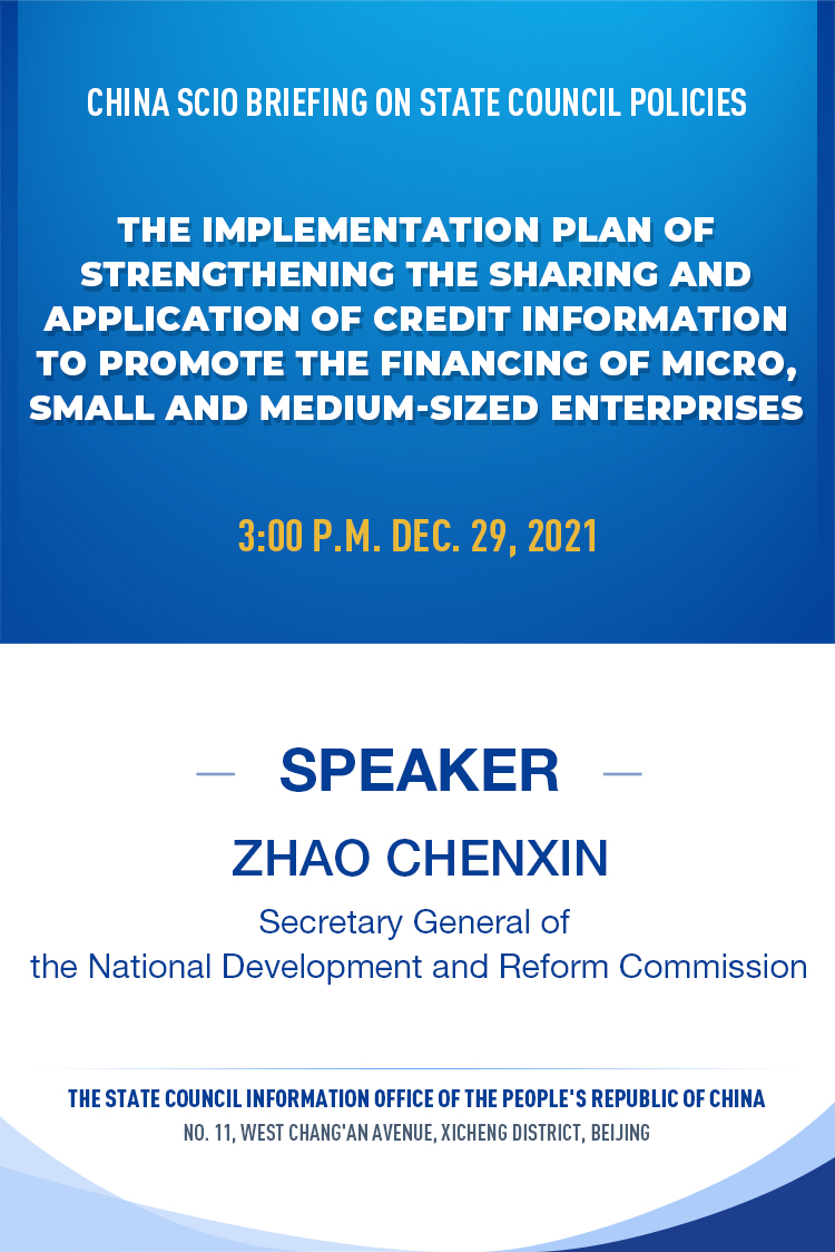The State Council Information Office will hold a policy briefing at 3 p.m. Wednesday on the Implementation Plan of Strengthening the Sharing and Application of Credit Information to Promote the Financing of Micro, Small and Medium-Sized Enterprises.