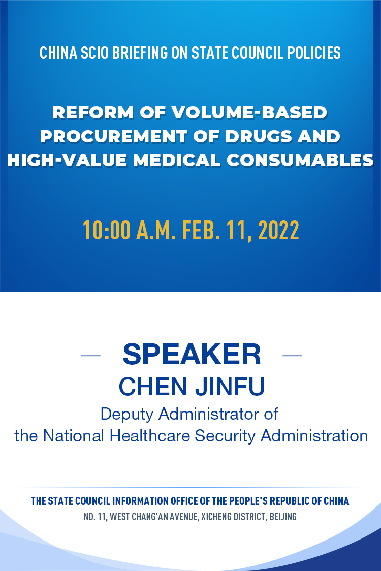 The State Council Information Office will hold a policy briefing at 10 a.m. Friday on the reform of volume-based procurement of drugs and high-value medical consumables.