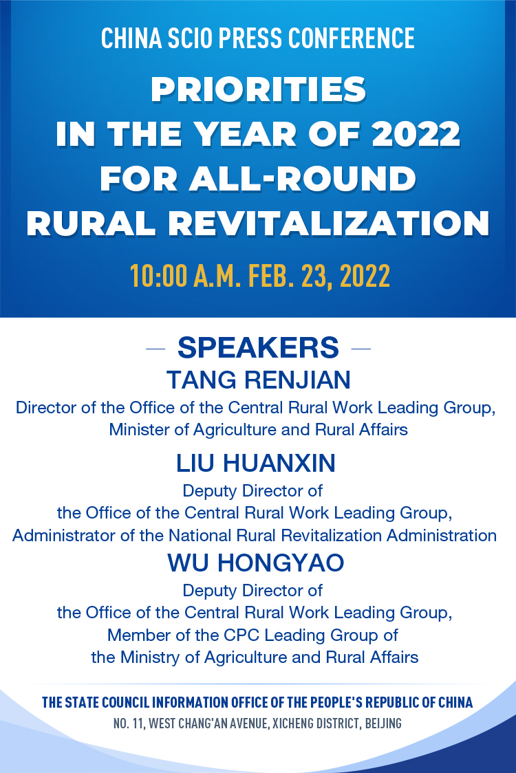 The State Council Information Office (SCIO) will hold a press conference at 10 a.m. Wednesday on China's priorities in the year of 2022 for all-round rural revitalization.