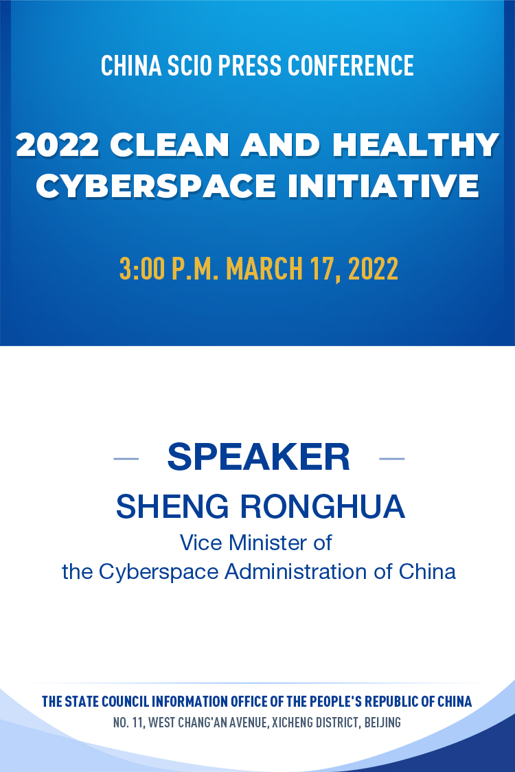 The State Council Information Office (SCIO) will hold a press conference at 3 p.m. Thursday on the 2022 Clean and Healthy Cyberspace Initiative.