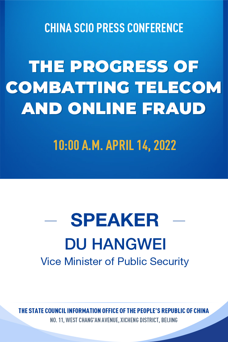 The State Council Information Office (SCIO) will hold a press conference at 10 a.m. Thursday on the progress of combatting telecom and online fraud.