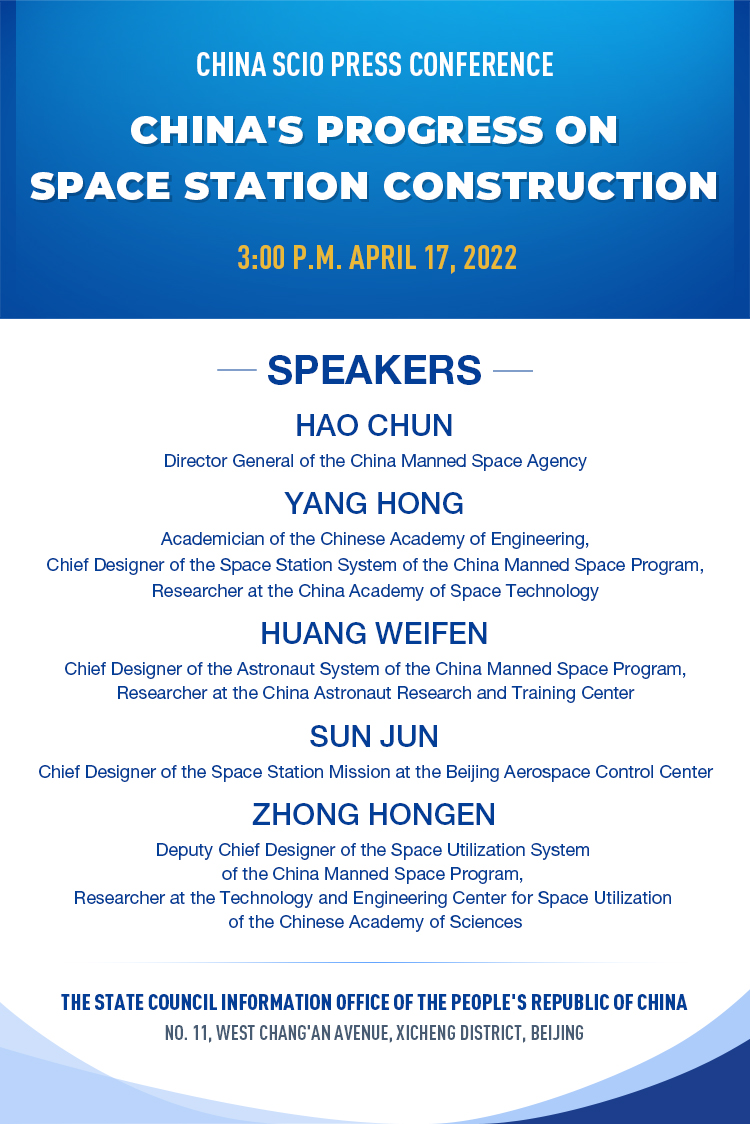 The State Council Information Office (SCIO) will hold a press conference at 3 p.m. Sunday about China's progress on space station construction.