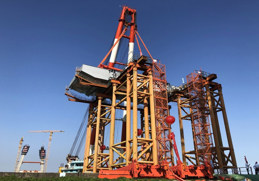 The first steel box girder is set up on the main bridge at the construction site of Hongqimen bridge in south China's Guangdong Province, April 10, 2022. (Xinhua/Liu Dawei)