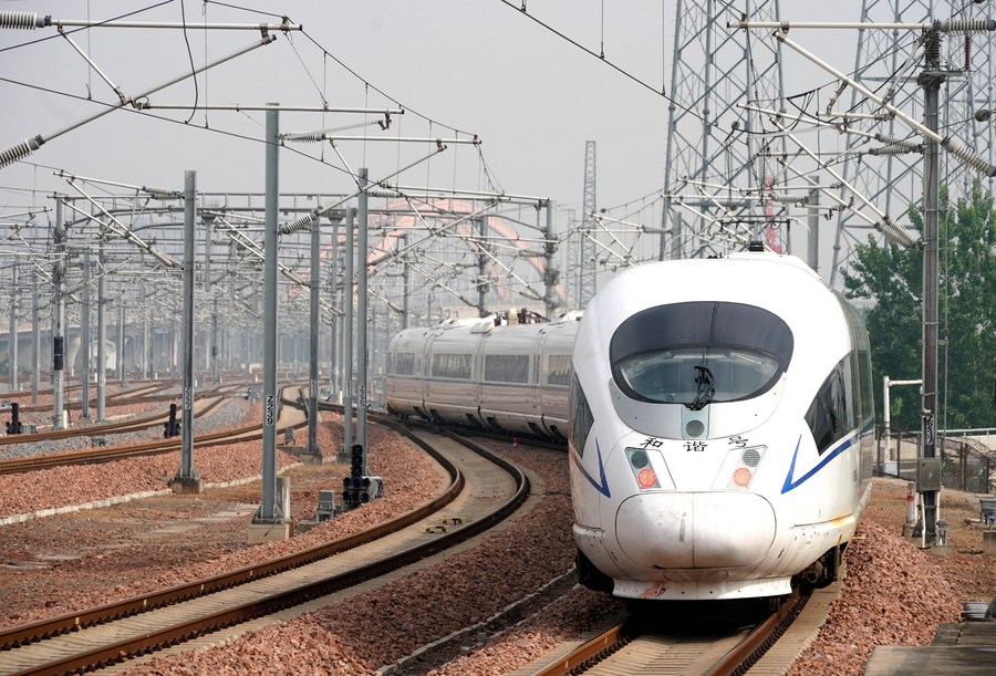 A bullet train departs from Zhengzhou East Railway Station during a trial run in Zhengzhou, central China's Henan Province, April 29, 2022. (Xinhua/Li An)