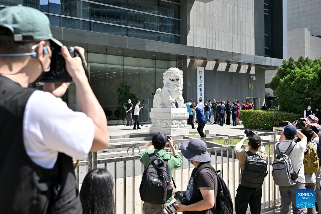 Journalists work outside the National Administration of Financial Regulation (NAFR) in Beijing, capital of China, May 18, 2023. The NAFR was officially set up on Thursday as China's new financial regulator, marking an important step in the country's institutional reform on financial supervision. (Xinhua/Li Xin)