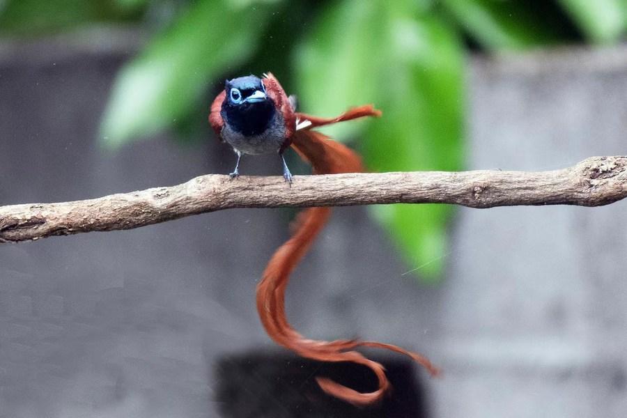 This photo taken in May 2023 shows an Asian paradise flycatcher standing on a branch in southwest China's Chongqing Municipality. (Photo by Yang Xiaoping/Xinhua)