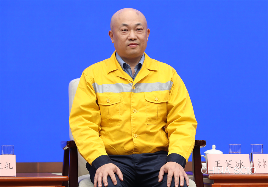 Wang Xiaobing, signal worker of the Haikou Comprehensive Maintenance Workshop of the Haikou Comprehensive Maintenance Section of China Railway Guangzhou Group Co. Ltd., speaks at a group interview in Beijing on Feb. 27, 2024. [Photo by Liu Jian/China SCIO]
