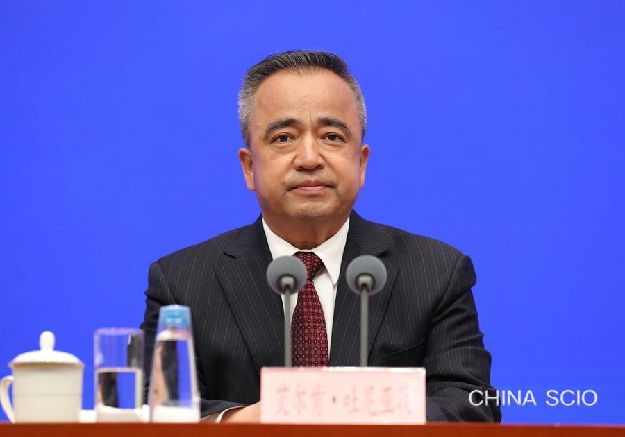 Erkin Tuniyaz, deputy secretary of the Communist Party of China Xinjiang Uygur Autonomous Regional Committee and chairman of Xinjiang Uygur autonomous region, attends a press conference in Beijing on May 21, 2024. [Photo by Xu Xiang/China SCIO]