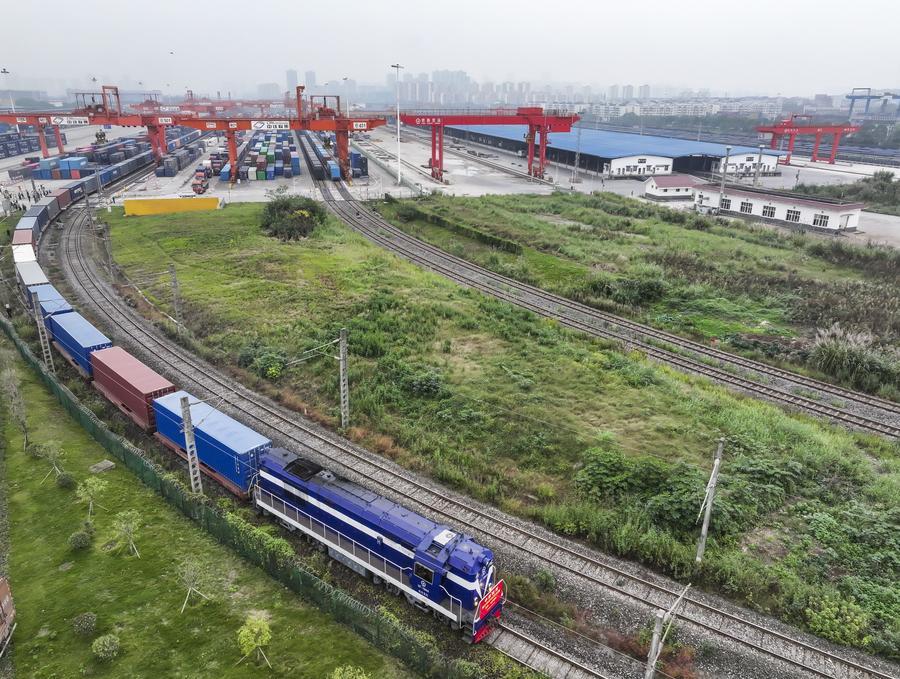 An aerial drone photo shows the 100,000th China-Europe freight train, coded X8083, departing from the Tuanjiecun Station in Chongqing, southwest China, Nov. 15, 2024. (Xinhua/Wang Quanchao)