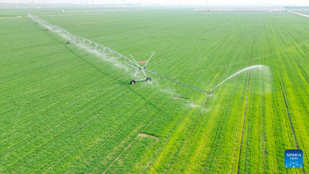 An aerial drone photo taken on April 9, 2025 shows a sprinkler irrigating crops at a field in Dongying, east China's Shandong Province. (Photo by Liu Yunjie/Xinhua)