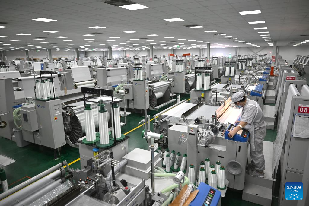 A staff member works at a new material firm in the Hongqi Canal Economic and Technological Development Zone of Linzhou City, central China's Henan Province, March 19, 2025. In the spring season, various private enterprises in the Hongqi Canal Economic and Technological Development Zone of Linzhou City are operating in full swing to fulfill orders. (Xinhua/Li Jianan)