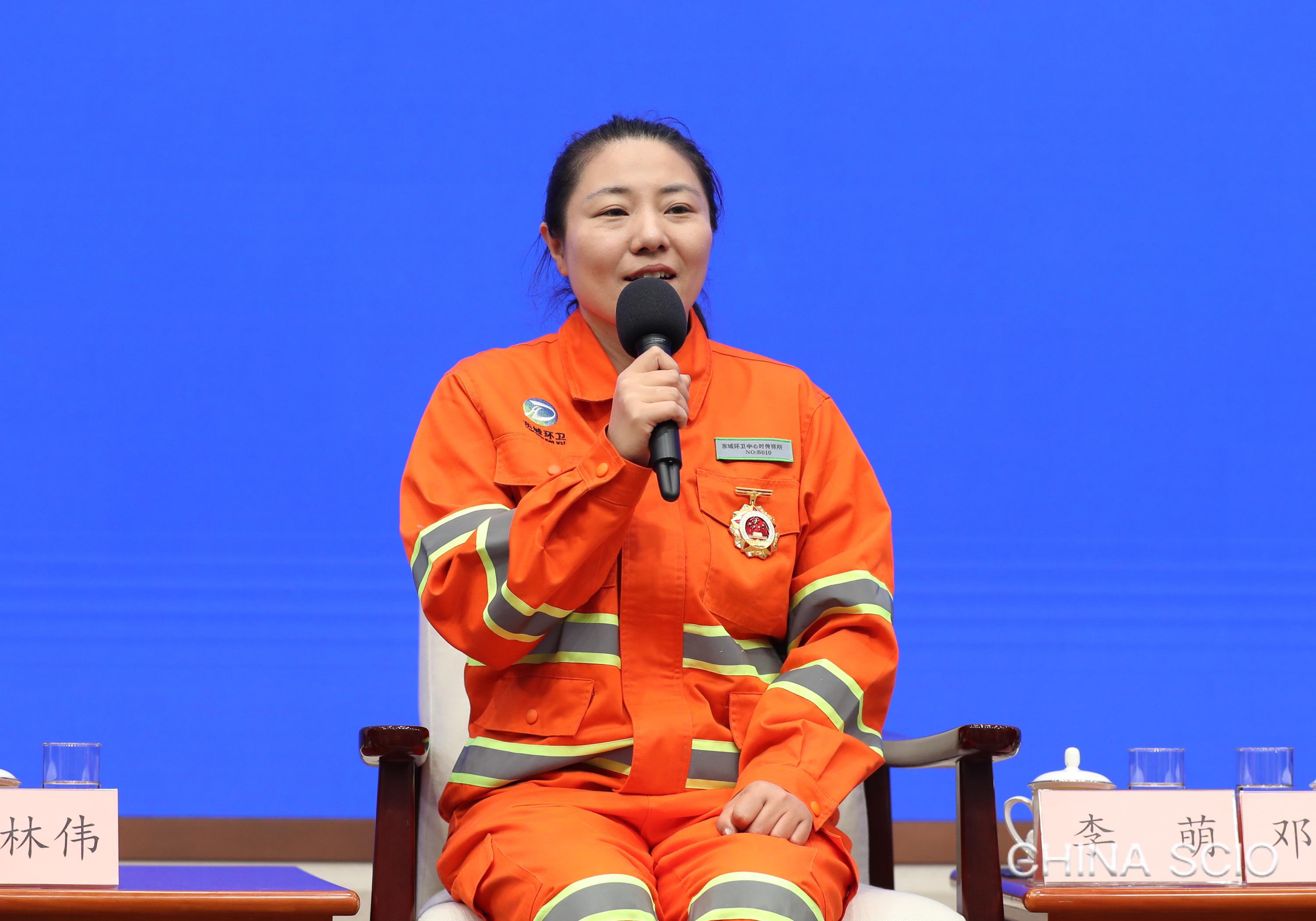 Li Meng, leader of the March 8th Women's Team, Shichuanxiang Station, Environmental Sanitation Service Center of Dongcheng District, Beijing, attends a group interview in Beijing, April 29, 2025. [Photo by Xu Xiang/China SCIO]