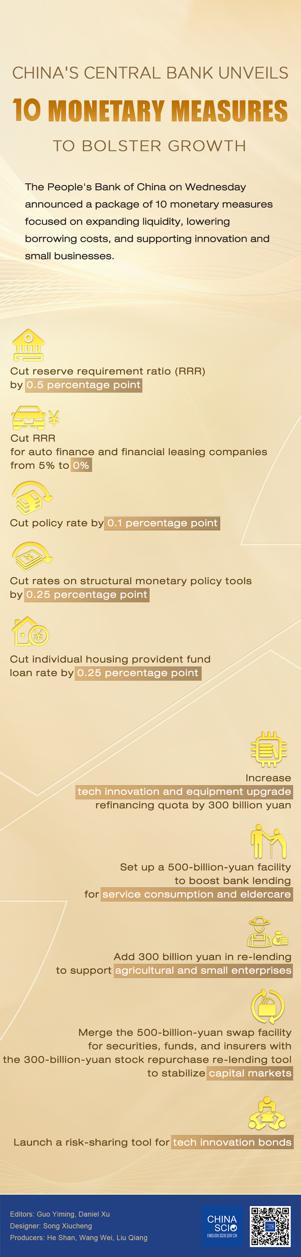 The People's Bank of China on Wednesday announced a package of 10 monetary measures focused on expanding liquidity, lowering borrowing costs, and supporting innovation and small businesses.