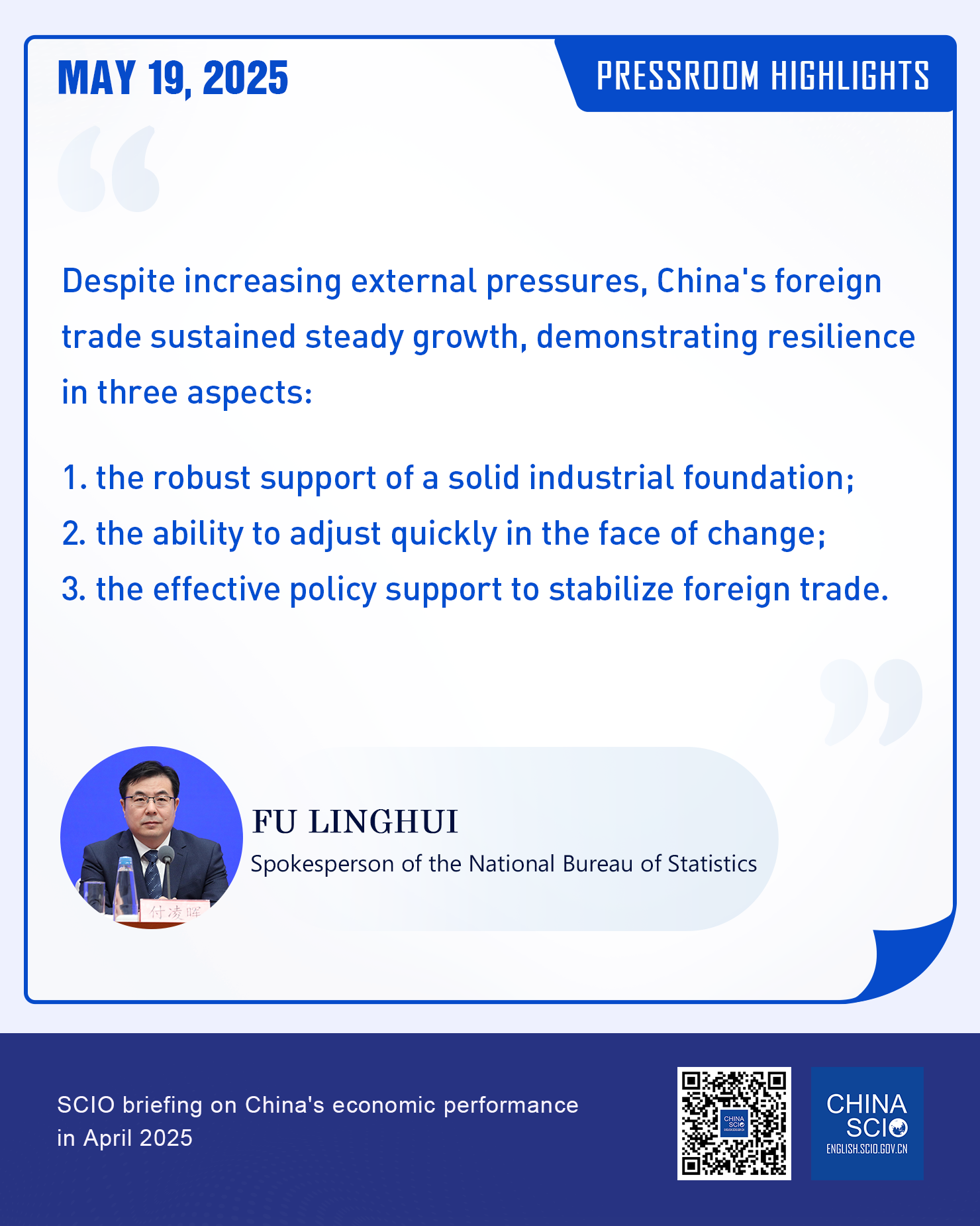 China's foreign trade grew steadily in April despite external pressures, an official from the National Bureau of Statistics said Monday. Official data shows that China's total import and export value in April expanded 5.6% year on year, with export jumping by 9.3%.