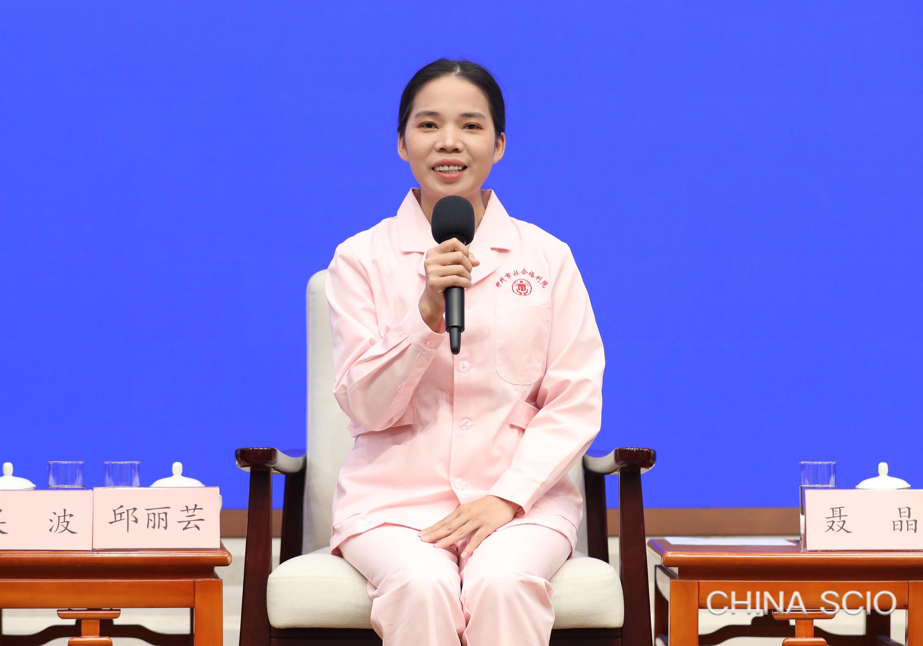 Qiu Liyun, head of the nursing group of the Liuzhou Social Welfare Institute of Guangxi Zhuang autonomous region, attends a group interview in Beijing, May 20, 2025. [Photo by Xu Xiang/China SCIO]