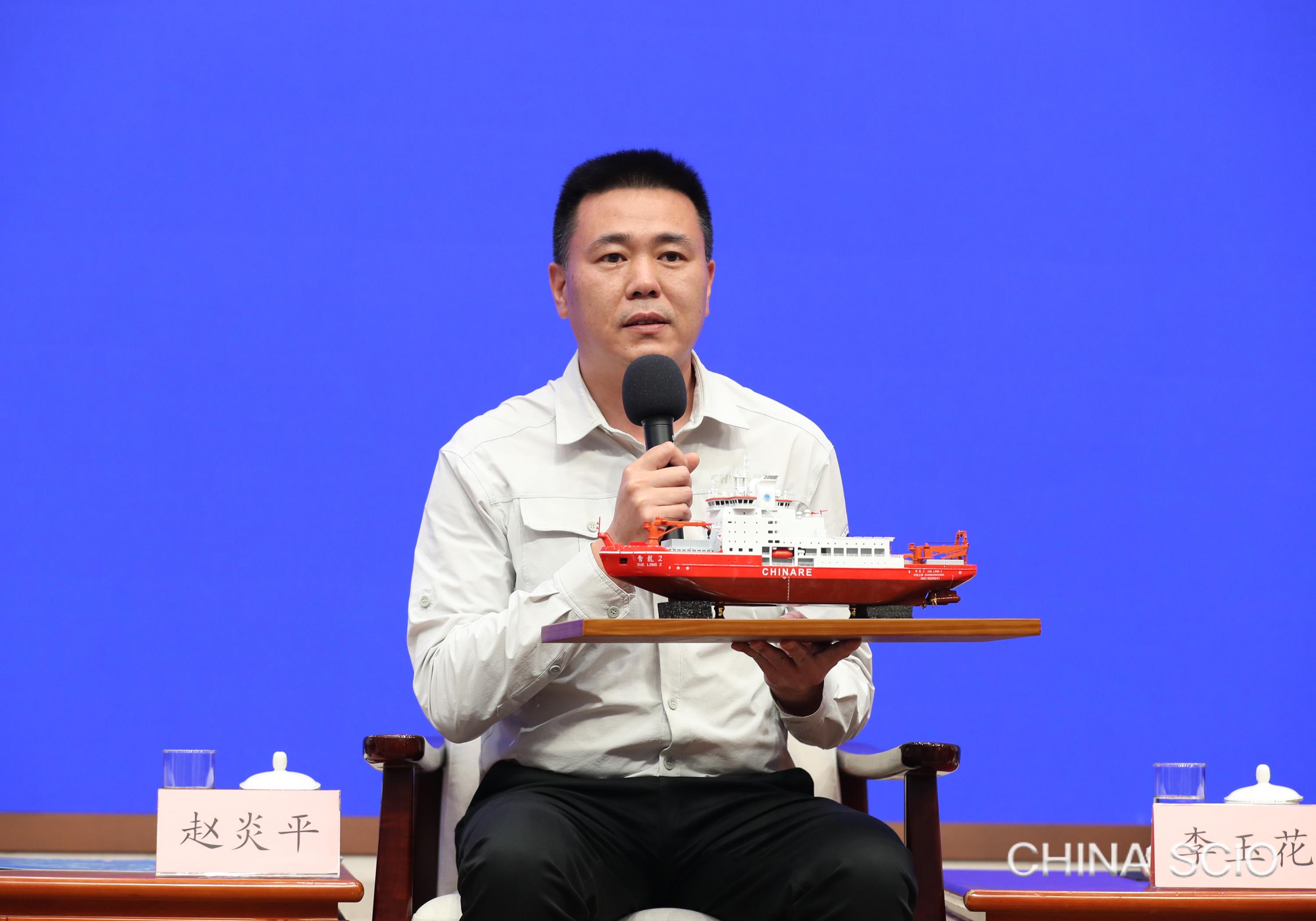 Zhao Yanping, director of the Polar Vessel Management Center of the Polar Research Institute of China and first captain of the Xuelong 2 icebreaker, attends a group interview in Beijing, May 21, 2025. [Photo by Xu Xiang/China SCIO]