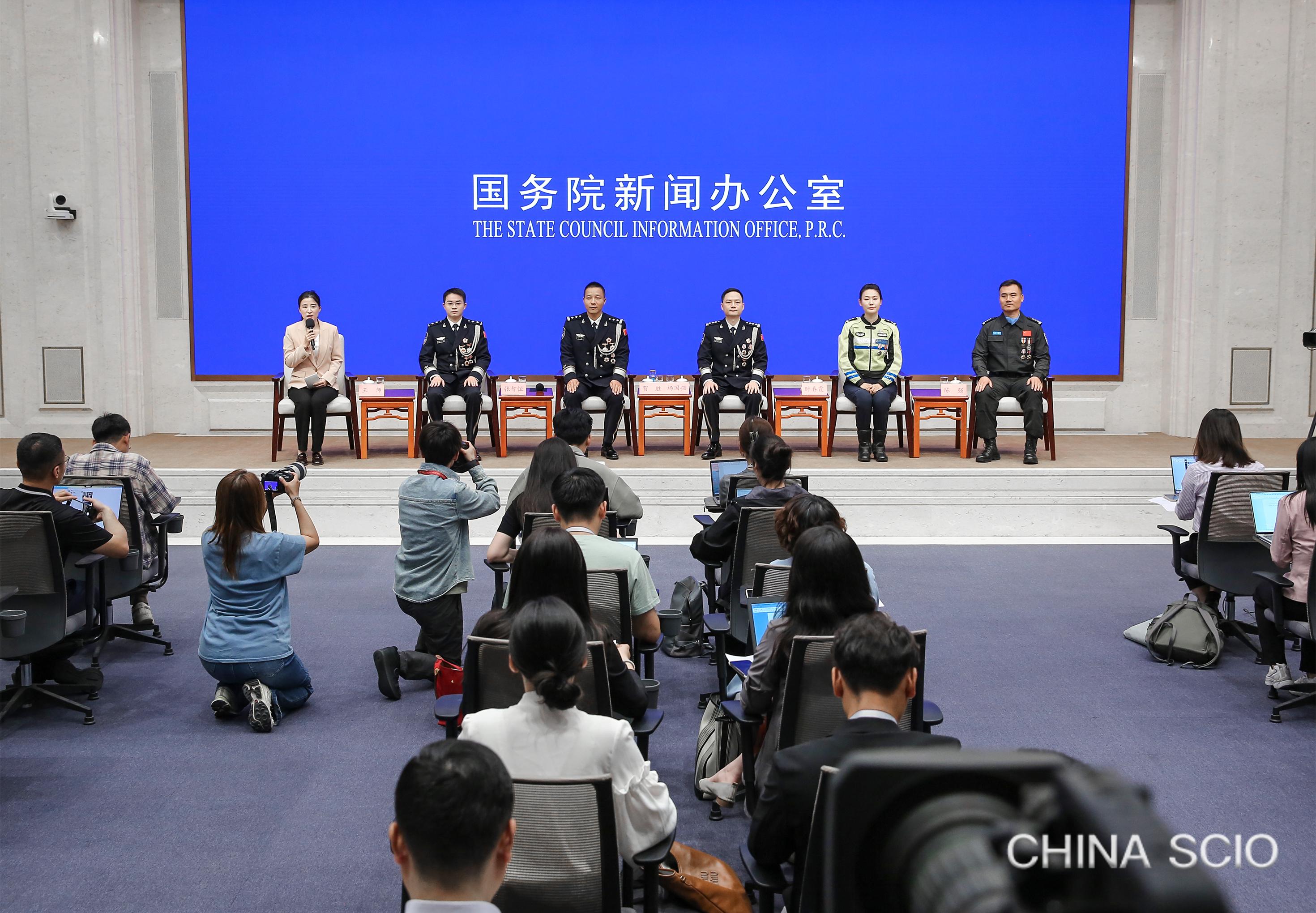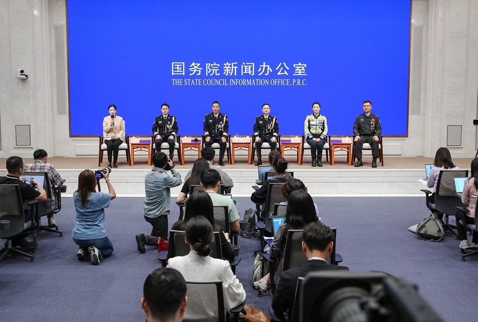On May 26, 2025, the State Council Information Office invites five representatives in the public security field to meet journalists and answer questions in Beijing. [Photo by Liu Jian/China SCIO]