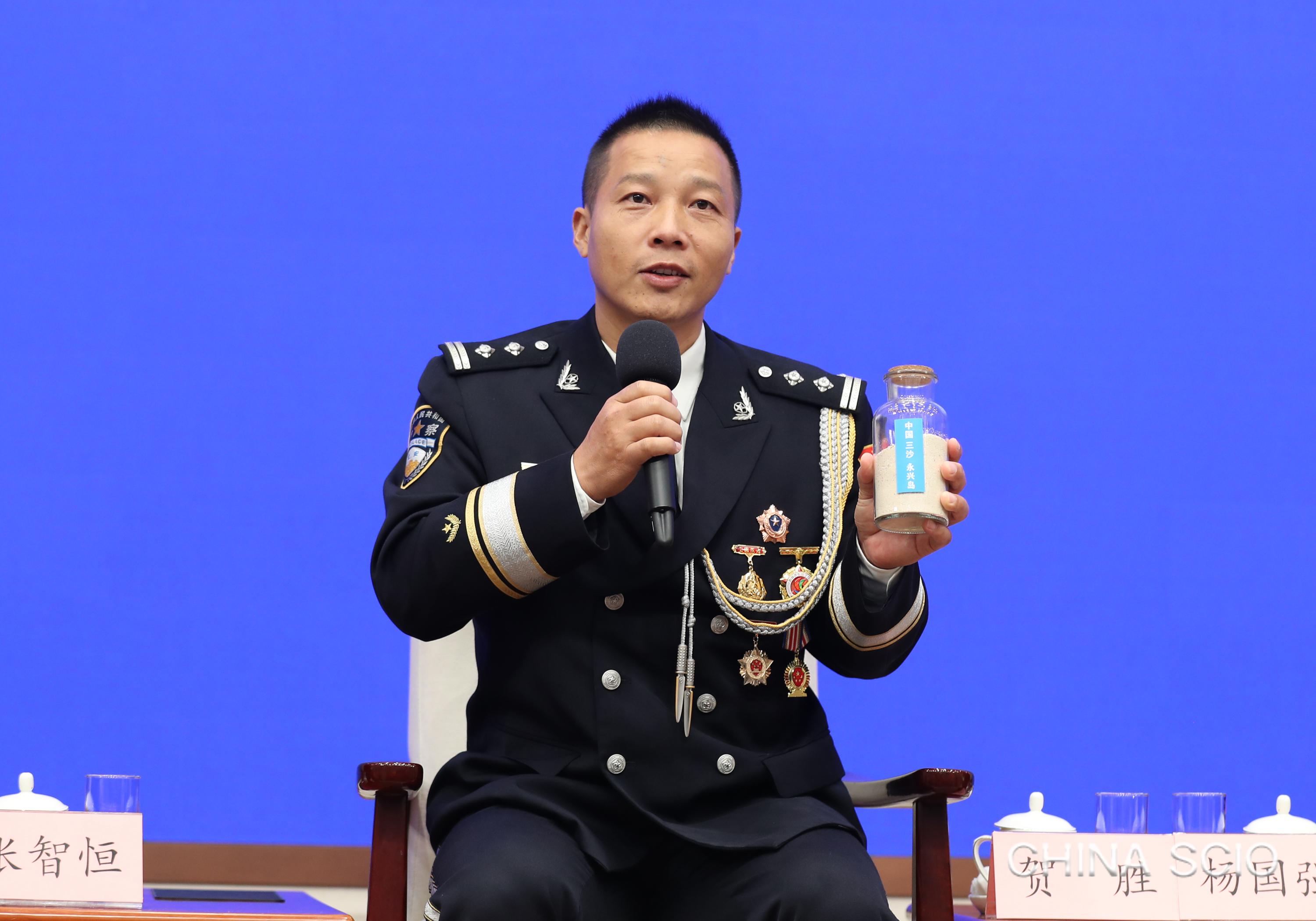 He Sheng, director of Yongxing Coast Police Station of the 8th Detachment of the Anti-Smuggling and Coast Management Division of the Hainan Provincial Department of Public Security, attends a group interview in Beijing, May 26, 2025. [Photo by Xu Xiang/China SCIO]