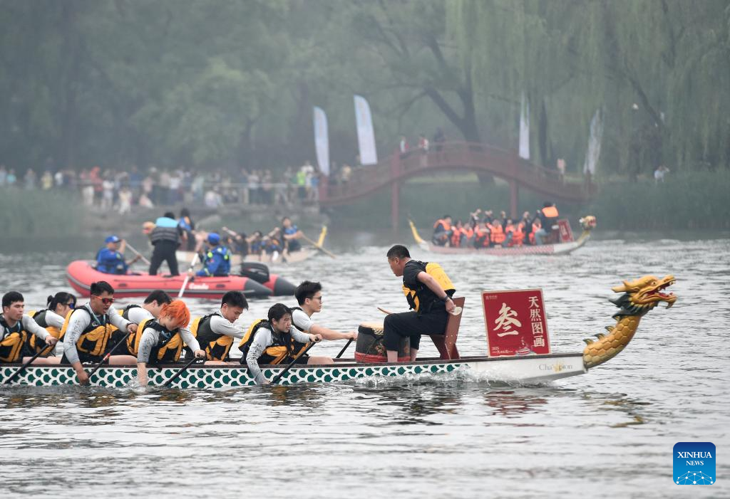 Teams from Beijing-based colleges compete in a dragon boat race on a lake at Yuanmingyuan Park in Beijing, capital of China, on May 31, 2025. (Xinhua/Luo Xiaoguang)