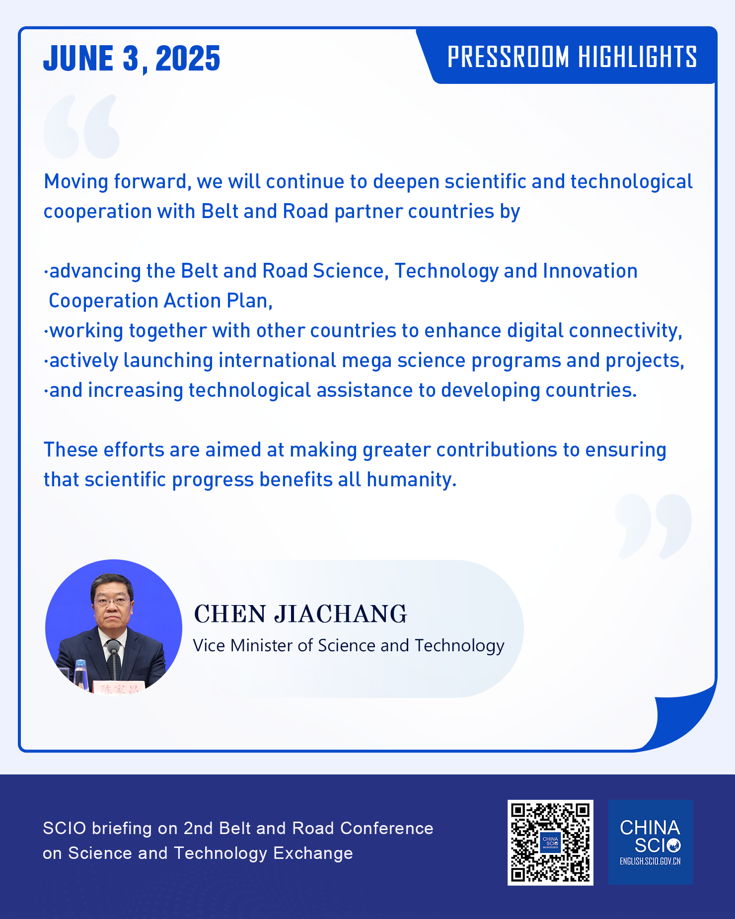China will continue to deepen scientific and technological cooperation with Belt and Road partner countries to ensure that scientific and technological progress is shared by all humanity, Vice Minister of Science and Technology Chen Jiachang said Tuesday.